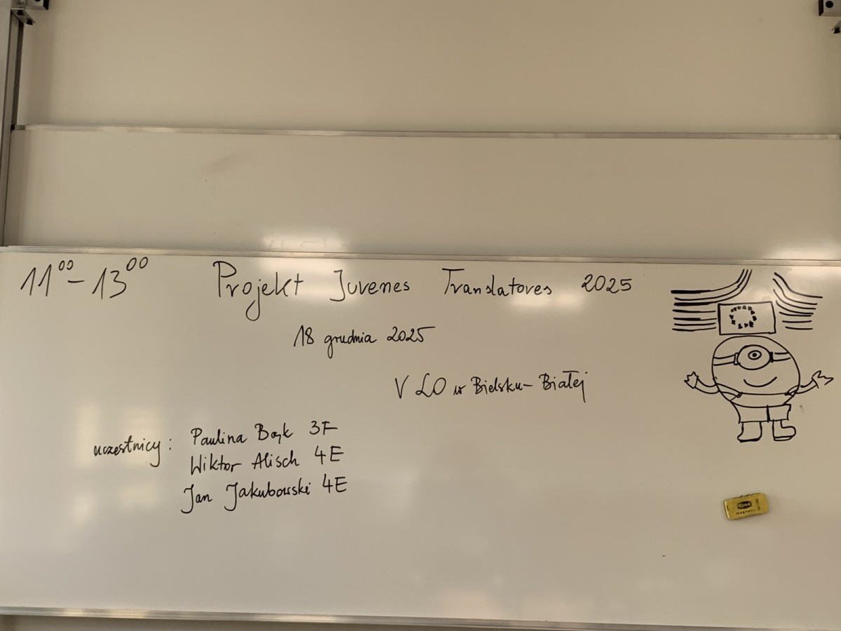 W czwartek 18 grudnia 2025 w naszej szkole odbył się konkurs tłumaczeniowy Lekcja Juvenes Translatores. W konkursie wzięli udział: 1 uczennica klasy 3F, Paulina Bąk oraz dwóch uczniów klasy 4E, Wiktor Alisch i Jan Jakubowski.
