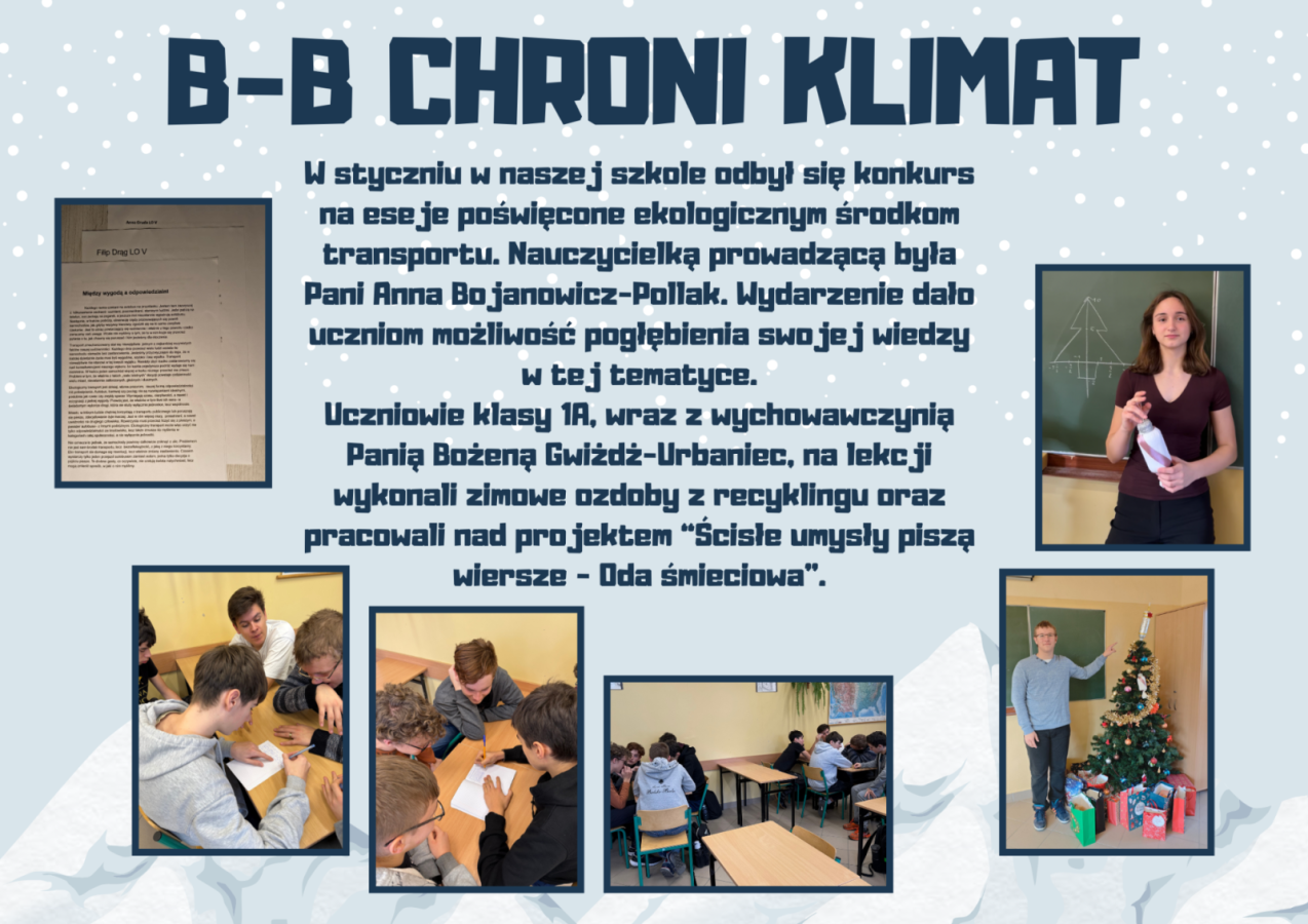 - Szkolny konkurs dla klas pierwszych na eseje o ekologicznym transporcie, prowadzony przez Panią Annę Bojanowicz-Pollak