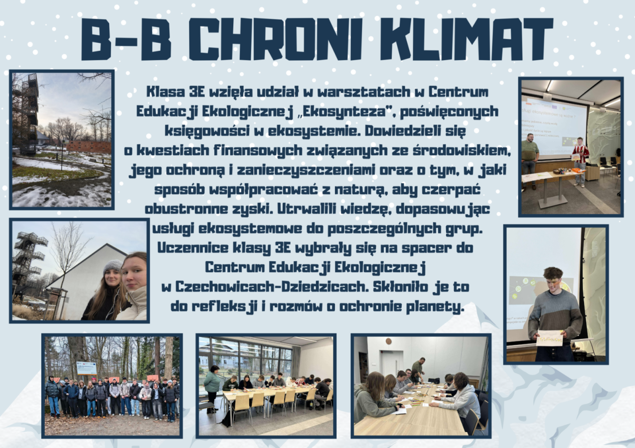 - Udział uczniów klasy 3E w warsztatach zorganizowanych przez Centrum Edukacji Ekologicznej "Ekosynteza", poświęconych księgowości w ekosystemie